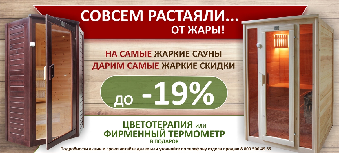 *Скидка 19% действует на все финские и инфракрасные сауны с керамическими нагревателями, скидка 9% действует на все инфракрасные сауны с карбоновыми нагревателями. При покупке любой инфракрасной сауны - дарим цветотерапию, при покупке финской сауны - фирменный термометр. Акция действует до 10 апреля 2019 г.